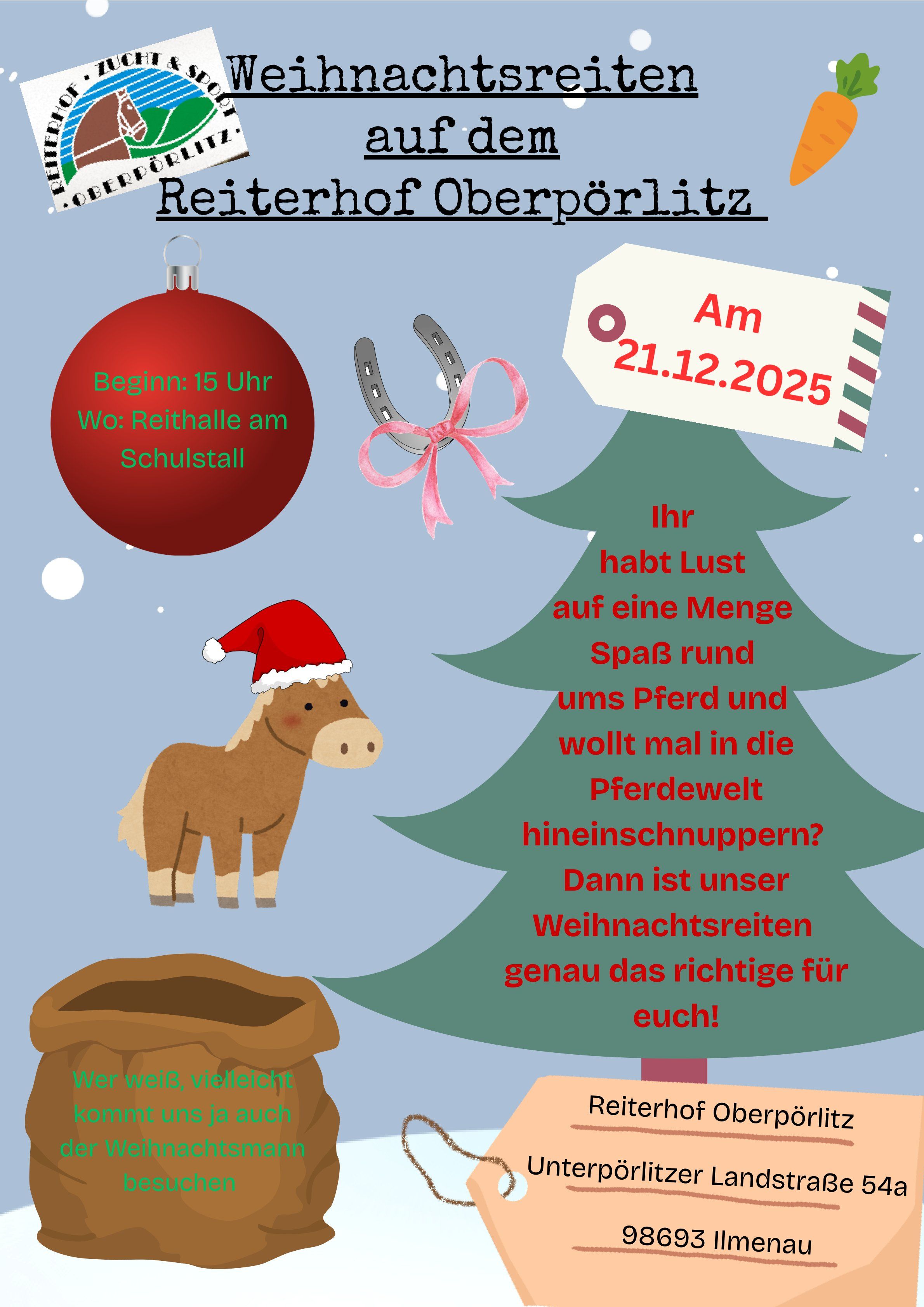 Liebe Kinder, wenn Euch das Warten auf den Weihnachtsmann viel zu lang dauert, dann besucht uns am 21.12.2025 ab 15.00 Uhr zu unserem Weihnachtsreiten! Es sind keine Vorkenntnisse erforderlich.